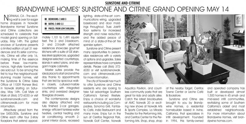 Brandywine Homes’ Sunstone and Citrine collections are scheduled to celebrate their model grand opening on Saturday, may 14th. The gated enclave of Sunstone presents a limited edition of just 31 residences and it’s sister community, Citrine will offer only 16, making time of the essence before these low-maintenance, high-style townhomes are sold out. To be among the first to tour the neighborhoods’ stunning model homes, visit the Sunstone & Citrine Sales Office at 11009 Pioneer Blvd. in norwalk starting on Saturday, may 14th. Call myle or mark at (866) 372-6030 or visit sunstonenorwalk.com and citrinenorwalk.com for more information.