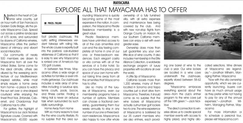 cated selections. Wine dinners at Mayacama are legendary.”—Jonathan Wilhelm, Managing Partner,Mayacama “Now with the villa ownership opportunity, which we are currently launching, buyers can have as much annual usage as they prefer while not having to pay for any of the annual expenses.”—Jonathan Wilhelm, Managing Partner, Mayacama For more information or to schedule a personal tour, please visit Mayacama.com