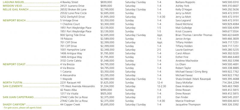 LAGUNA NIGUEL..........................................4 Bawley Street $839,000 Saturday | Sunday 1-4 Barbara Roppolo 949.500.0310 MISSION VIEJO.................................................. 24121 Juaneno Drive $699,000 Saturday 1-4 Ashley York 949.310.6607 NELLIE GAIL RANCH ......................................... 26532 Broken Bit Lane $2,749,000 Saturday | Sunday 1-4 Kelly O’Hagan 949.292.5636 25532 Lone Pine Circle $2,695,000 Sunday 1-5 Jerry La Mott 949.472.9191 5252 Derbyhill Drive $1,995,000 Saturday 1-4:30 Jerry La Mott 949.472.9191 NEWPORT BEACH ............................................. 5 Vintage Drive $3,350,000 Sunday 1-4 Sara Legrand 949.472.9191 1 Cheshire Court $3,300,000 Sunday 1-4 David McHone 949.929.4084 1951 Port Weybridge Place $3,139,000 Saturday 1-5 Mali Gulledge 949.500.4399 1951 Port Weybridge Place $3,139,000 Sunday 1-5 Kristi Cousens 949.677.5554 900 Spring Tide Drive $2,695,000 Saturday | Sunday Appt. Brian Thomas | Jennifer Thomas 949.422.6409 19 Palazzo $2,589,000 Sunday 1-4 Janice Arrigo 949.466.3839 701 Cliff Drive $2,399,000 Saturday Appt. Tiffany Holden 949.717.7251 701 Cliff Drive $2,399,000 Sunday 1-4 Tiffany Holden 949.717.7251 1001 Hampshire Lane $2,348,000 Saturday 2-5 Laurie Eastman 949.280.5235 1406 Antigua Way $1,795,000 Saturday 1-4 Carol Allison 949.302.0220 1406 Antigua Way $1,795,000 Sunday 1-4 Esther Fine 949.466.6483 3132 Corte Caleta $1,348,000 Sunday 1-4 Andrew Machoskie 949.302.5398 NEWPORT COAST ............................................. 4 Via Brezza $4,795,000 Saturday 1-4 Lis Olsen 949.500.4691 4 Via Brezza $4,795,000 Sunday 1-4 Robert Taylor 949.338.8885 1 Catania $3,350,000 Saturday 1-4 Michael Fawaz | Ginny Berg 949.922.7762 4 Alessandria $3,295,000 Saturday 1-4 Michael Fawaz 949.922.7762 1 Wayside $2,980,000 Saturday | Sunday 1-4 Shala Emdadi | Mark Ravanpak 949.395.4688 NORTH TUSTIN.................................................. 2231 Racquet Hill $1,625,000 Sunday 12-4 Stacy McKellar 714.264.2294 SAN CLEMENTE................................................. 175 West Avenida Alessandro $1,334,000 Saturday 12-2:30 Dave Anderson 949.463.1969 42 Paseo Alba $999,000 Sunday 1-4 Drew Rowan 949.412.5815 1217 Via Visalia $925,000 Saturday 1-4 Drew Rowan 949.412.5815 SAN JUAN CAPISTRANO................................... 27442 Calle De La Rosa $2,375,000 Saturday 2-5 Dan Finder 949.545.2037 27442 Calle De La Rosa $2,375,000 Sunday 1-4:30 Marcie Friedman 949.606.6610 SHADY CANYON ® ............................................. 44 Copper Creek $5,695,000 Saturday | Sunday 1-4 Jacqueline Thompson 949.326.3392 -For gate access,pleasecallagentslisted.