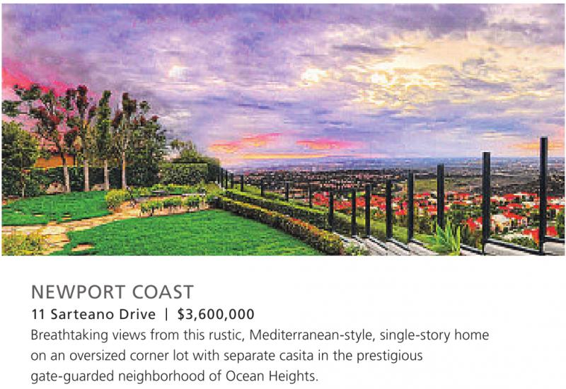 11 Sarteano Drive | $3,600,000 Breathtaking views from this rustic, Mediterranean-style, single-story home on an oversized corner lot with separate casita in the prestigious gate-guarded neighborhood of Ocean Heights.