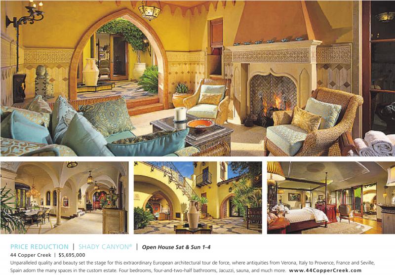 PRICE REDUCTION | SHADY CANYON ® | Open House Sat & Sun 1-4 44 Copper Creek | $5,695,000 Unparalleled quality and beauty set the stage for this extraordinary European architectural tour de force, where antiquities from Verona, Italy to Provence, France and Seville, Spain adorn the many spaces in the custom estate. Four bedrooms, four-and-two-half bathrooms, Jacuzzi, sauna, and much more. www.44CopperCreek.com