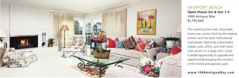 NEWPORT BEACH Open House Sat & Sun 1-4 1406 Antigua Way $1,795,000 This charming four bed, three bath home was custom built by the original owners and has been meticulously maintained. Featuring a downstairs master suite, office, and craft room with access to a large attic, there is ample opportunity to upgrade and expand while enjoying the comfort of this home and spacious yard. www.1406AntiguaWay.com