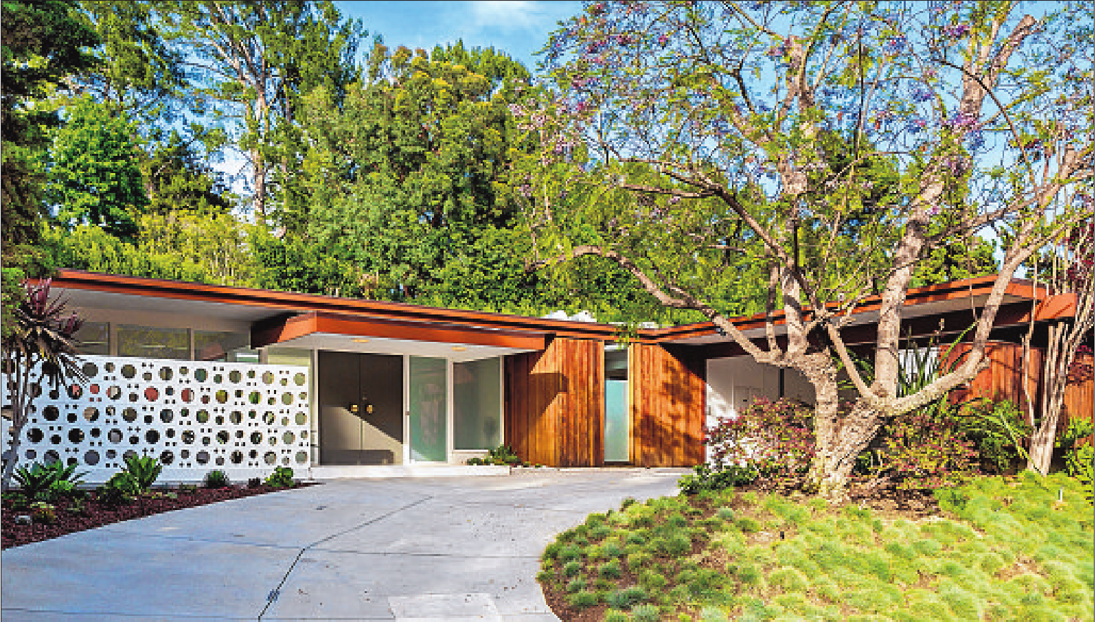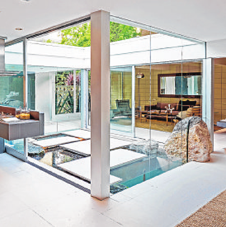 Designed by prominent local architect Edward H. Fickett, the 1950s post-and-beam retains its vintage good looks with clean lines, exposed beams and circular wall partitions. Living spaces take in a central atrium and water feature set inside walls of glass.