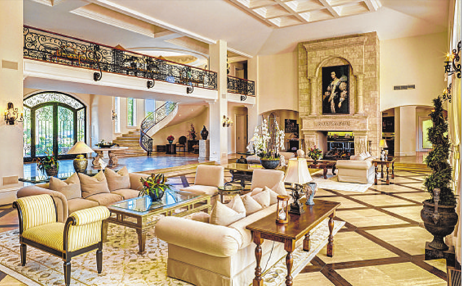 Formal rooms were designed for large-scale entertaining and have an old-world ambience. Beamed ceilings, massive stone fireplaces and wrought-iron work are among the interior details. A two-story foyer with two sweeping staircases provides a grand entrance.
