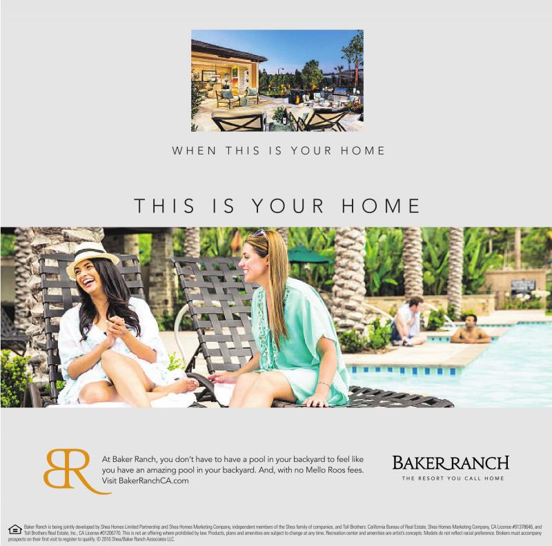 W H E N T H I S I S Y O U R H O M E T H I S I S Y O U R H O M E At Baker Ranch, you don’t have to have a pool in your backyard to feel like you have an amazing pool in your backyard. And, with no Mello Roos fees. THE RESORT YOU CALL HOME Visit BakerRanchCA.com Baker Ranchisbeing jointly developed bySheaHomes Limited Partnership and Shea Homes MarketingCompany,independent membersofthe Sheafamilyofcompanies,and Toll Brothers.California Bureau of Real Estate, SheaHomes Marketing Company, CA License #01378646, and Toll BrothersReal Estate,Inc.,CALicense #01206770. This is not an offering where prohibited by law. Products,plans and amenitiesare subject to change at anytime. Recreation center andamenities areartist’sconcepts. Models do notreflect racialpreference. Brokersmust accompany prospects on their first visit to register to qualify.©2016 Shea/Baker Ranch Associates LLC.