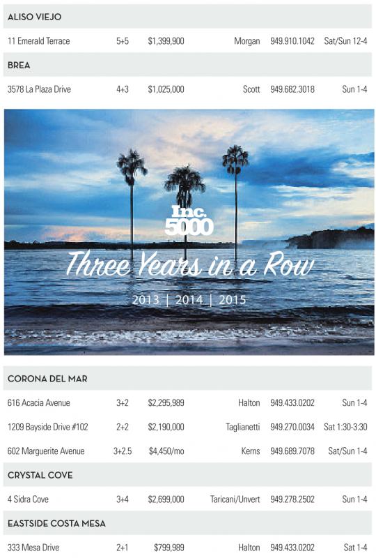 ALISO VIEJO 11 Emerald Terrace 5+5 $1,399,900 Morgan 949.910.1042 Sat/Sun 12-4 BREA 3578 La Plaza Drive 4+3 $1,025,000 Scott 949.682.3018 Sun 1-4 Three Years in a Row 2013 | 2014 | 2015 CORONA DEL MAR 616 Acacia Avenue 3+2 $2,295,989 Halton 949.433.0202 Sun 1-4 1209 Bayside Drive #102 2+2 $2,190,000 Taglianetti 949.270.0034 Sat 1:30-3:30 602 Marguerite Avenue 3+2.5 $4,450/mo Kerns 949.689.7078 Sat/Sun 1-4 CRYSTALCOVE 4Sidra Cove 3+4 $2,699,000 Taricani/Unvert 949.278.2502 Sun 1-4 EASTSIDE COSTA MESA 333 Mesa Drive 2+1 $799,989 Halton 949.433.0202 Sat 1-4