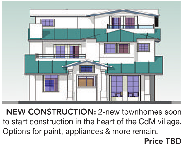 NEW CONSTRUCTION: 2-new townhomes soon to start construction in the heart of the CdM village. Options for paint, appliances & more remain.