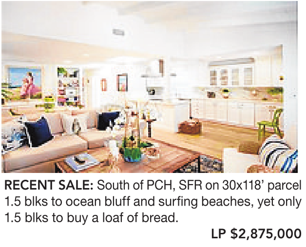RECENT SALE: South of PCH, SFR on 30x118’ parcel 1.5 blks to ocean bluff and surfing beaches, yet only 1.5 blks to buy a loaf of bread.