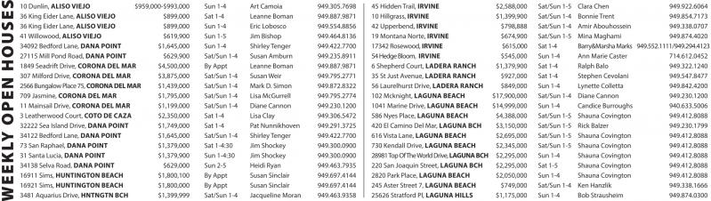 45 Hidden Trail, IRVINE $2,588,000 Sat/Sun 1-5 ClaraChen 949.922.6064 10 Hillgrass, IRVINE $1,399,900 Sat/Sun1-4 Bonnie Trent 949.854.7173 42 Upperbend, IRVINE $798,888 Sat/Sun 1-4 Amir Abouhossein 949.338.0707 19 Montana Norte, IRVINE $674,900 Sat/Sun1-5 Mina Maghami 949.874.4020 17342 Rosewood, IRVINE $615,000 Sat1-4 Barry&Marsha Marks 949.552.1111/949.294.4123 54 Hedge Bloom, IRVINE $545,000 Sun 1-4 AnnMarie Caster 714.612.0452 6Shepherd Court, LADERARANCH $1,379,900 Sat1-4 Ralph Balo 949.322.1240 35 St Just Avenue, LADERARANCH $927,000 Sat 1-4 StephenCevolani 949.547.8477 56 Laurelhurst Drive, LADERARANCH $849,000 Sun 1-4 LynetteColletta 949.842.4200 102 Mcknight, LAGUNA BEACH $17,900,000 Sat/Sun 1-4 Diane Cannon 949.230.1200 1041 Marine Drive, LAGUNA BEACH $14,999,000 Sun 1-4 CandiceBurroughs 940.633.5006 586NyesPlace, LAGUNA BEACH $4,388,000 Sat/Sun 1-5 Shauna Covington 949.412.8088 420 El Camino DelMar, LAGUNA BCH $3,150,000 Sat/Sun1-5 Rick Balzer 949.230.1799 616 VistaLane, LAGUNA BEACH $2,695,000 Sat/Sun 1-5 ShaunaCovington 949.412.8088 730 Kendall Drive, LAGUNA BEACH $2,345,000 Sat/Sun 1-5 Shauna Covington 949.412.8088 28981TopOfTheWorldDrive, LAGUNA BCH $2,295,000 Sun 1-4 Shauna Covington 949.412.8088 220San Joaquin Street, LAGUNA BCH $2,295,000 Sat1-5 Shauna Covington 949.412.8088 2820 Park Place, LAGUNA BEACH $2,050,000 Sun 1-4 Shauna Covington 949.412.8088 245 AsterStreet 7, LAGUNA BEACH $749,000 Sat/Sun 1-4 Ken Hanzlik 949.338.1666 25626 StratfordPl, LAGUNA HILLS $1,175,000 Sun 1-4 BobStrausheim 949.874.0300