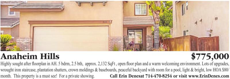 Anaheim Hills $775,000 Highly sought after floorplan in AH. 5bdrm, 2.5 bth, approx. 2,132 SqFt ,open floor plan and awarm welcoming environment. Lots of upgrades, wrought iron staircase, plantation shutters, crown moldings &baseboards, peaceful backyard with room for apool, light &bright, low HOA $80/ month. This property is amust see! For aprivate showing. Call Erin Denesat 714-470-8254 or visit www.ErinDenes.com