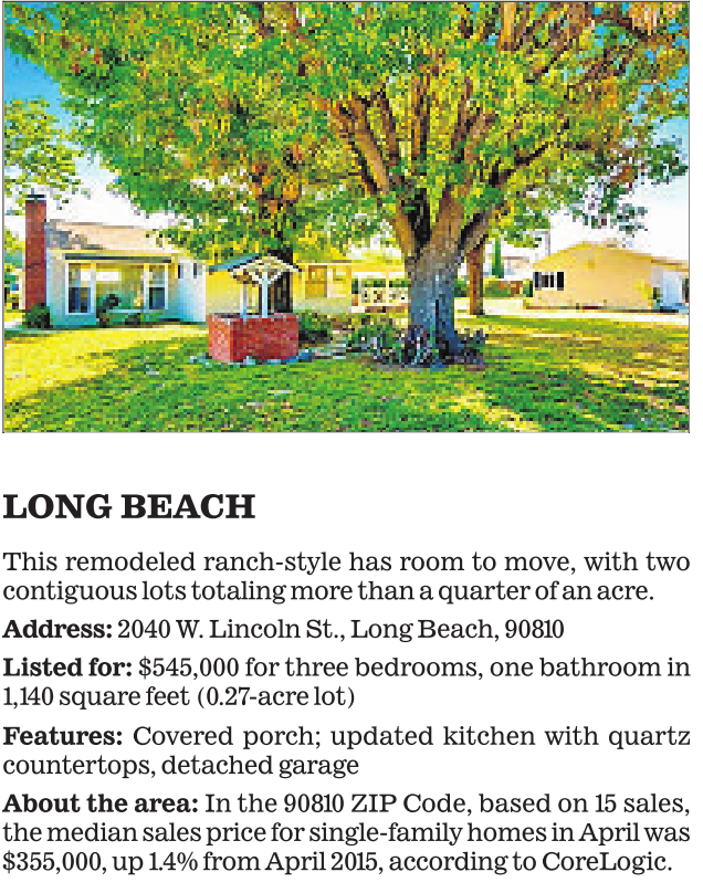 LONG BEACH This remodeled ranch-style has room to move, with two contiguous lots totaling more than a quarter of an acre. Address: 2040 W. Lincoln St., Long Beach, 90810 Listed for: $545,000 for three bedrooms, one bathroom in 1,140 square feet (0.27-acre lot) Features: Covered porch; updated kitchen with quartz countertops, detached garage About the area: In the 90810 ZIP Code, based on 15 sales, the median sales price for single-family homes in April was $355,000, up 1.4% from April 2015, according to CoreLogic.
