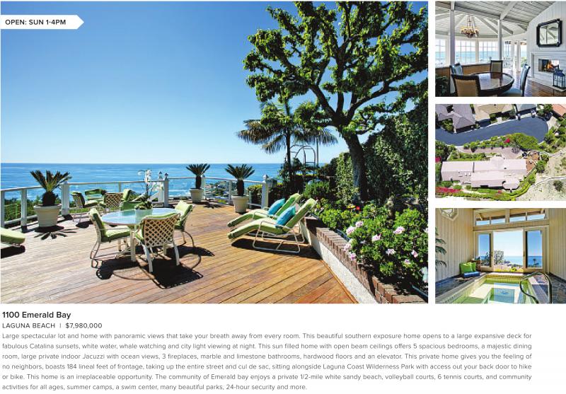 LAGUNA BEACH | $7,980,000 Large spectacular lot and home with panoramic views that take your breath away from every room. This beautiful southern exposure home opens to a large expansive deck for fabulous Catalina sunsets, white water, whale watching and city light viewing at night. This sun filled home with open beam ceilings offers 5 spacious bedrooms, a majestic dining room, large private indoor Jacuzzi with ocean views, 3 fireplaces, marble and limestone bathrooms, hardwood floors and an elevator. This private home gives you the feeling of no neighbors, boasts 184 lineal feet of frontage, taking up the entire street and cul de sac, sitting alongside Laguna Coast Wilderness Park with access out your back door to hike or bike. This home is an irreplaceable opportunity. The community of Emerald bay enjoys a private 1/2-mile white sandy beach, volleyball courts, 6 tennis courts, and community activities for all ages, summer camps, a swim center, many beautiful parks, 24-hour security and more.