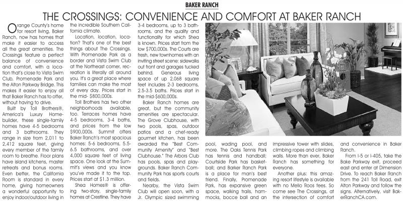 County’s home for resort living, Baker Ranch, now has homes that make it easier to access all the great amenities. The Crossings feature a perfect balance of convenience and comfort, with a location that’s close to vista Swim Club, Promenade Park and the Alton Parkway Bridge. This makes it easier to enjoy all that Baker Ranch has to offer, without having to drive.