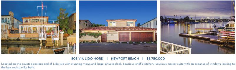 808 VIA LIDO NORD | NEWPORT BEACH | $8,750,000 Located on the coveted eastern end of Lido Isle with stunning views and large, private dock. Spacious chef’s kitchen, luxurious master suite with an expanse of windows looking to the bay and spa-like bath.