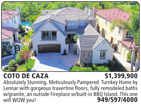 COTO DE CAZA $1,399,900 Absolutely Stunning, Meticulously Pampered Turnkey Home by Lennar with gorgeous travertine floors,fully remodeledbaths w/granite, an outsideFireplace w/built-in BBQIsland.This one will WOW you! 949/597/4000