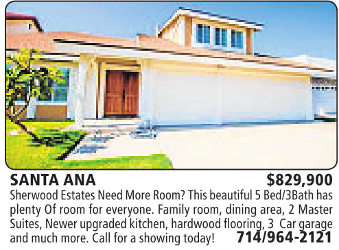 SANTA ANA $829,900 Sherwood EstatesNeedMoreRoom? This beautiful5Bed/3Bath has plenty Of room for everyone. Family room, dining area, 2Master Suites, Newerupgraded kitchen, hardwood flooring, 3 Car garage andmuch more.Callfor ashowing today! 714/964-2121
