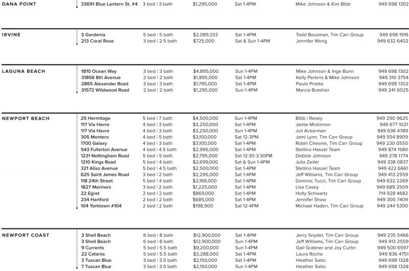 NEWPORT BEACH 25 Hermitage 5 bed | 7 bath $4,500,000 Sun 1-4PM Bibb | Raney 949 290 9625 117 Via Havre 4 bed | 3 bath $3,250,000 Sat 1-4PM Jamie Mckinnon 949 677 1021 117 Via Havre 4 bed | 3 bath $3,250,000 Sun 1-4PM Juli Ackerman 949 636 4789 305 Montero 4 bed | 5 bath $3,150,000 Sat 12-3PM Jami Lynn, Tim Carr Group 949 554 8909 1700 Galaxy 4 bed | 3 bath $3,100,000 Sat 1-4PM Robin Chesnie, Tim Carr Group 949 230 0550 543 Fullerton Avenue 4 bed | 4.5 bath $2,995,000 Sat 1-4PM Stellino Hassel Team 949 874 1580 1231 Nottingham Road 5 bed | 5 bath $2,795,000 Sat 12:30-3:30PM Debbie Johnson 949 278 1774 1210 Kings Road 5 bed | 4 bath $2,699,000 Sat & Sun 1-4PM Julia Zeiler 949 338 0837 321 Aliso Avenue 5 bed | 4.5 bath $2,500,000 Sat 1-4PM Stellino Hassel Team 949 422 6661 625 Saint James Road 3 bed | 2 bath $2,295,000 Sat 1-4PM Jeff Williams, Tim Carr Group 949 413 2559 118 24th Street 5 bed | 4 bath $2,168,000 Sat 1-4PM Dominic Tucci, Tim Carr Group 949 632 2269 1827 Mariners 3 bed | 2 bath $1,225,000 Sat 1-4PM Lisa Casey 949 689 2509 22 Egret 2 bed | 2 bath $869,000 Sat 1-4PM Holly Schwartz 714 928 4682 234 Hartford 2 bed | 2 bath $685,000 Sat 1-4PM Jennifer Shaw 949 300 7409 104 Yorktown #104 2 bed | 2 bath $198,900 Sat 12-4PM Michael Haden, Tim Carr Group 949 244 5300 NEWPORT COAST 3 Shell Beach 6 bed | 8 bath $12,900,000 Sat 1-4PM Jerry Snyder, Tim Carr Group 949 235 5466 3 Shell Beach 6 bed | 8 bath $12,900,000 Sun 1-4PM Jeff Williams, Tim Carr Group 949 413 2559 9 Currents 5 bed | 5.5 bath $9,200,000 Sun 1-4PM Gail Grabner and Joy Curtin 949 500 6597 22 Catania 5 bed | 5.5 bath $3,288,000 Sat 1-4PM Laura Roche 949 836 4751 3 Tuscan Blue 3 bed | 3.5 bath $2,150,000 Sat 1-4PM Heather Saito 949 698 1328 7 Tuscan Blue 3 bed | 3.5 bath $2,150,000 Sun 1-4PM Heather Saito 949 698 1328