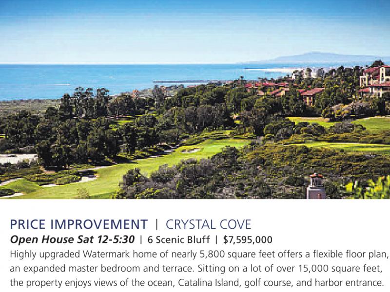 PRICE IMPROVEMENT | CRYSTAL COVE Open House Sat 12-5:30 | 6 Scenic Bluff | $7,595,000 Highly upgraded Watermark home of nearly 5,800 square feet offers a flexible floor plan, an expanded master bedroom and terrace. Sitting on a lot of over 15,000 square feet, the property enjoys views of the ocean, Catalina Island, golf course, and harbor entrance.