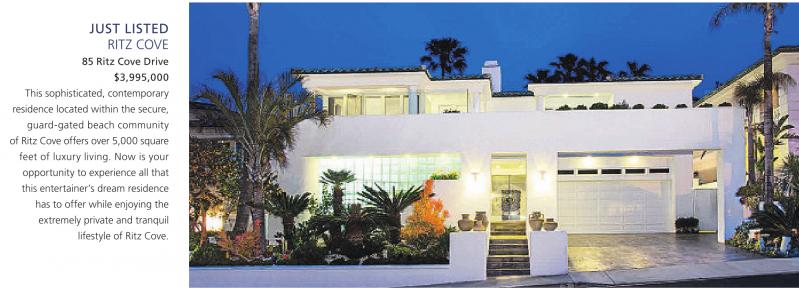 JUST LISTED RITZ COVE 85 Ritz Cove Drive $3,995,000 This sophisticated, contemporary residence located within the secure, guard-gated beach community of Ritz Cove offers over 5,000 square feet of luxury living. Now is your opportunity to experience all that this entertainer’s dream residence has to offer while enjoying the extremely private and tranquil lifestyle of Ritz Cove.