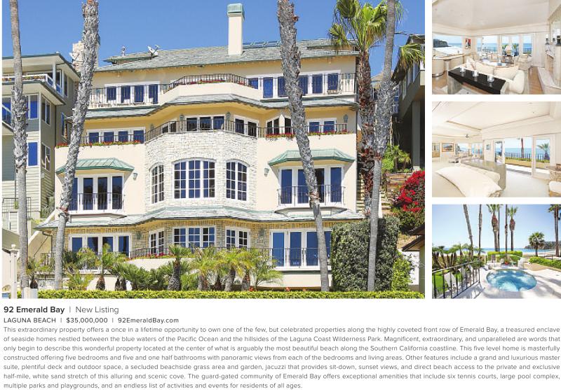 LAGUNA BEACH | $35,000,000 | 92EmeraldBay.com This extraordinary property offers a once in a lifetime opportunity to own one of the few, but celebrated properties along the highly coveted front row of Emerald Bay, a treasured enclave of seaside homes nestled between the blue waters of the Pacific Ocean and the hillsides of the Laguna Coast Wilderness Park. Magnificent, extraordinary, and unparalleled are words that only begin to describe this wonderful property located at the center of what is arguably the most beautiful beach along the Southern California coastline. This five level home is masterfully constructed offering five bedrooms and five and one half bathrooms with panoramic views from each of the bedrooms and living areas. Other features include a grand and luxurious master suite, plentiful deck and outdoor space, a secluded beachside grass area and garden, jacuzzi that provides sit-down, sunset views, and direct beach access to the private and exclusive half-mile, white sand stretch of this alluring and scenic cove. The guard-gated community of Emerald Bay offers exceptional amenities that include six tennis courts, large pool complex, multiple parks and playgrounds, and an endless list of activities and events for residents of all ages.