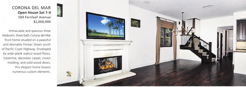 CORONA DEL MAR Open House Sat 1-4 504 Fernleaf Avenue $2,000,000 Immaculate and spacious three bedroom, three bath Corona del Mar front home situated on a peaceful and desirable Flower Street south of Pacific Coast Highway. Enveloped by wide-plank walnut wood floors, travertine, decorator carpet, crown molding, and solid wood doors, this elegant home boasts numerous custom elements. See also