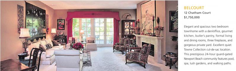 Elegant and spacious two bedroom townhome with a den/office, gourmet kitchen, butler’s pantry, formal living and dining rooms, three fireplaces, and gorgeous private yard. Excellent quiet Towne Collection cul-de-sac location. This prestigious 24-hour guard-gated Newport Beach community features pool, spa, lush gardens, and walking paths.