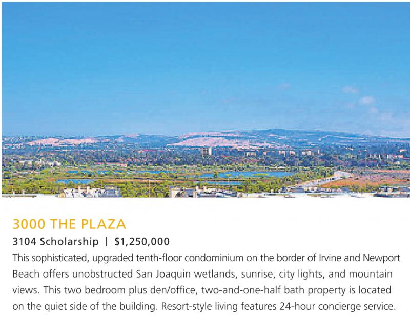 3000 THE PLAZA 3104 Scholarship | $1,250,000 This sophisticated, upgraded tenth-floor condominium on the border of Irvine and Newport Beach offers unobstructed San Joaquin wetlands, sunrise, city lights, and mountain views. This two bedroom plus den/office, two-and-one-half bath property is located on the quiet side of the building. Resort-style living features 24-hour concierge service.