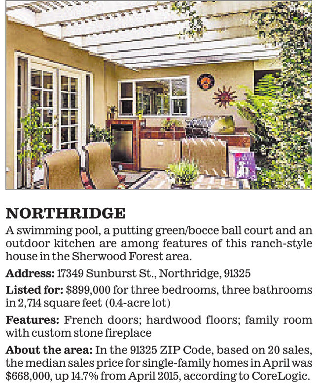 NORTHRIDGE Aswimming pool, a putting green/bocce ball court and an outdoor kitchen are among features of this ranch-style house in the Sherwood Forest area. Address: 17349 Sunburst St., Northridge, 91325 Listed for: $899,000 for three bedrooms, three bathrooms in 2,714 square feet (0.4-acre lot) Features: French doors; hardwood floors; family room with custom stone fireplace About the area: In the 91325 ZIP Code, based on 20 sales, the median sales price for single-family homes in April was $668,000, up 14.7% from April 2015, according to CoreLogic.