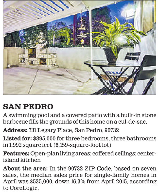 SAN PEDRO Aswimming pool and a covered patio with a built-in stone barbecue fills the grounds of this home on a cul-de-sac. Address: 731 Legary Place, San Pedro, 90732 Listed for: $895,000 for three bedrooms, three bathrooms in 1,992 square feet (6,159-square-foot lot) Features: Open-plan living areas; coffered ceilings; centerisland kitchen About the area: In the 90732 ZIP Code, based on seven sales, the median sales price for single-family homes in April was $535,000, down 16.3% from April 2015, according to CoreLogic.