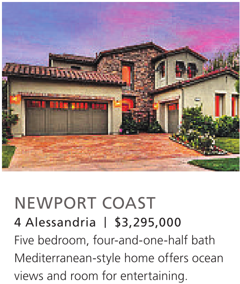 4 Alessandria | $3,295,000 Five bedroom, four-and-one-half bath Mediterranean-style home offers ocean views and room for entertaining.