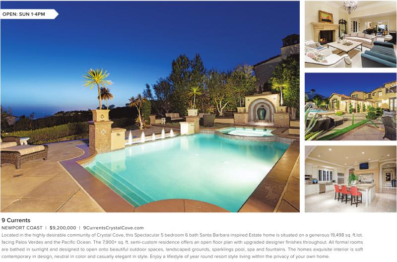 OPEN: SUN 1-4PM 9 Currents NEWPORT COAST | $9,200,000 | 9CurrentsCrystalCove.com Located in the highly desirable community of Crystal Cove, this Spectacular 5 bedroom 6 bath Santa Barbara inspired Estate home is situated on a generous 19,498 sq. ft.lot. facing Palos Verdes and the Pacific Ocean. The 7,900+ sq. ft. semi-custom residence offers an open floor plan with upgraded designer finishes throughout. All formal rooms are bathed in sunlight and designed to open onto beautiful outdoor spaces, landscaped grounds, sparklings pool, spa and fountains. The homes exquisite interior is soft contemporary in design, neutral in color and casually elegant in style. Enjoy a lifestyle of year round resort style living within the privacy of your own home. See also
