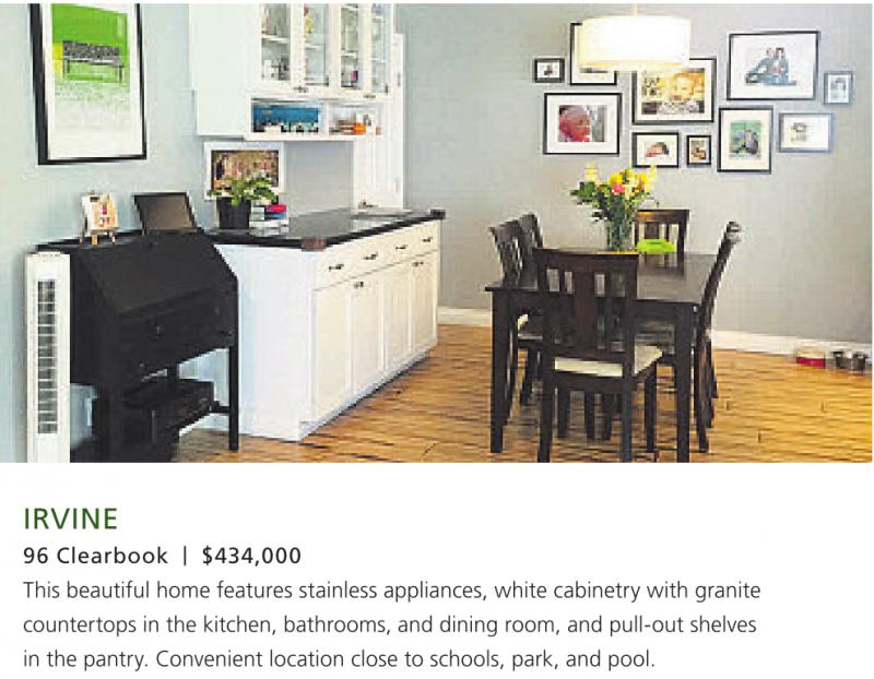 IRVINE 96 Clearbook | $434,000 This beautiful home features stainless appliances, white cabinetry with granite countertops in the kitchen, bathrooms, and dining room, and pull-out shelves in the pantry. Convenient location close to schools, park, and pool. See also