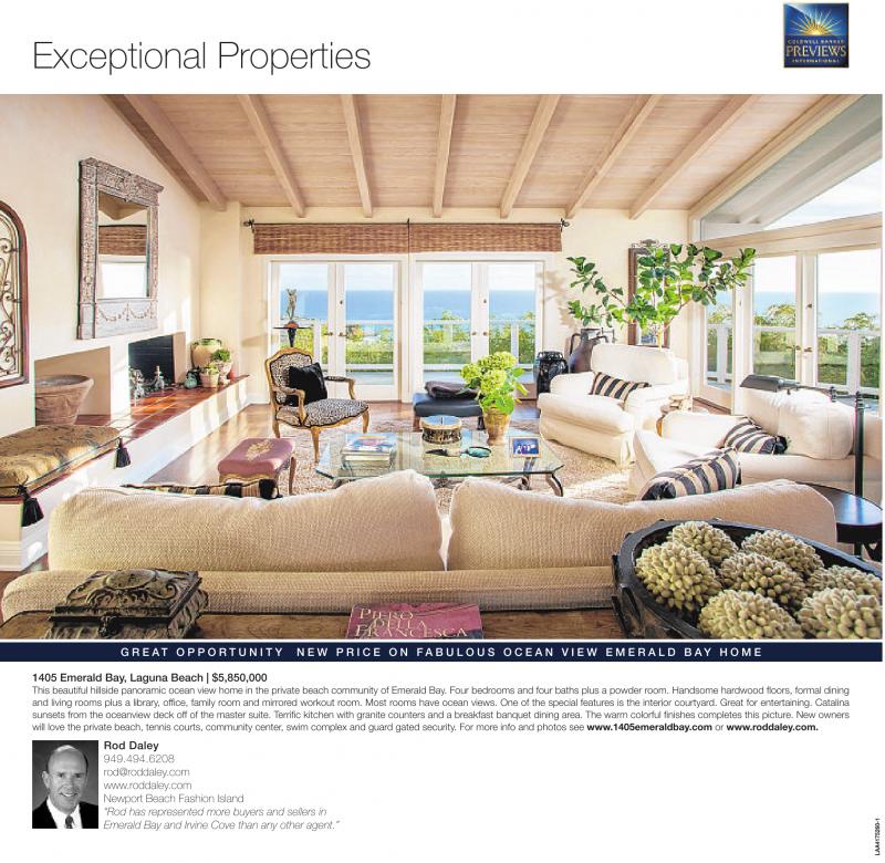 1405 Emerald Bay, Laguna Beach | $5,850,000 This beautiful hillside panoramic ocean view home in the private beach community of Emerald Bay. Four bedrooms and four baths plus a powder room. Handsome hardwood floors, formal dining and living rooms plus a library, office, family room and mirrored workout room. Most rooms have ocean views. One of the special features is the interior courtyard. Great for entertaining. Catalina sunsets from the oceanview deck off of the master suite. Terrific kitchen with granite counters and a breakfast banquet dining area. The warm colorful finishes completes this picture. New owners will love the private beach, tennis courts, community center, swim complex and guard gated security. For more info and photos see www.1405emeraldbay.com or www.roddaley.com.