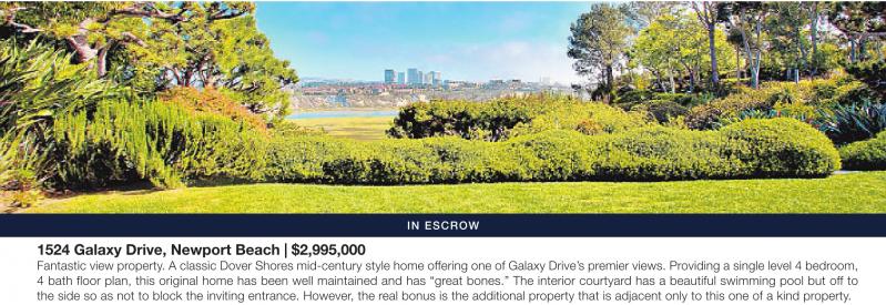 IN ESCROW 1524 Galaxy Drive, Newport Beach | $2,995,000 Fantastic view property. A classic Dover Shores mid-century style home offering one of Galaxy Drive’s premier views. Providing a single level 4 bedroom, 4 bath floor plan, this original home has been well maintained and has “great bones.” The interior courtyard has a beautiful swimming pool but off to the side so as not to block the inviting entrance. However, the real bonus is the additional property that is adjacent only to this one of a kind property. See also