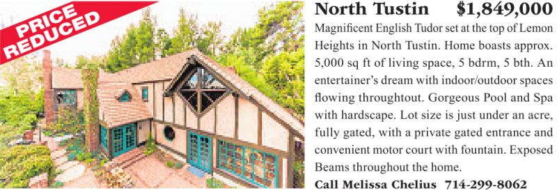 North Tustin $1,849,000 MagnificentEnglish Tudor set at thetop of Lemon Heights in North Tustin. Home boasts approx. 5,000 sq ft of living space, 5 bdrm, 5 bth. An entertainer’s dreamwithindoor/outdoor spaces flowing throughtout. Gorgeous Pool and Spa with hardscape. Lot size is just under an acre, fully gated, with a private gated entrance and convenient motorcourt with fountain.Exposed Beams throughout the home. Call Melissa Chelius 714-299-8062