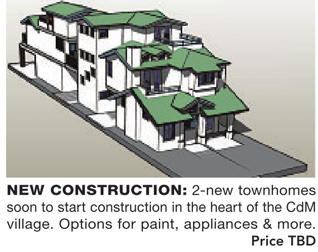 NEW CONSTRUCTION: 2-new townhomes soon to start construction in the heart of the CdM village. Options for paint, appliances & more.
