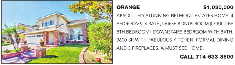 ORANGE $1,030,000 ABSOLUTELY STUNNING BELMONT ESTATES HOME, 4 BEDROOMS, 4BATH, LARGE BONUS ROOM (COULD BE 5TH BEDROOM), DOWNSTAIRS BEDROOMWITHBATH, 3600 SF WITH FABULOUS KITCHEN, FORMAL DINING AND 3FIREPLACES. AMUST SEE HOME!
