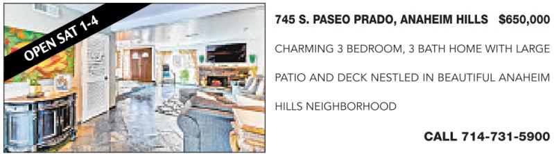 745 S. PASEO PRADO, ANAHEIM HILLS $650,000 CHARMING 3 BEDROOM, 3 BATH HOME WITH LARGE PATIO AND DECK NESTLED IN BEAUTIFUL ANAHEIM HILLS NEIGHBORHOOD CALL 714-731-5900