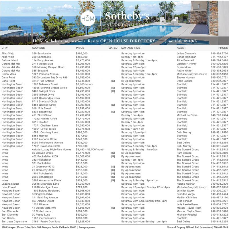 Aliso Viejo 259 Sandcastle $465,000 Saturday 1pm-4pm Julian Channels 949.394.3736 Aliso Viejo 259 Sandcastle $465,000 Sunday 1pm-4pm Sonaz Hamidian 714.742.5477 Balboa Island 114 Ruby Avenue $2,475,000 Saturday & Sunday 1pm-4pm Alice Brownell 949.294.6495 Corona del Mar 2711 Ocean Blvd $8,995,000 Saturday 2pm-5pm Gordon F. Henry 949.500.1236 Corona del Mar 318 Morning Canyon Road $5,495,000 Saturday 12pm-3pm Bryan Mora 562.506.3079 Corona del Mar 535 Seaward $3,495,000 Saturday 1pm-4pm Andre White 949.378.9653 Costa Mesa 1827 Pomona Avenue $1,300,000 Saturday & Sunday 1pm-4pm Michelle Queyrel Linovitz 949.632.1618 Dana Point 34300 Lantern Bay Drive #86 $1,785,000 Saturday 1pm-4pm Shawn Noonan 949.400.0751 Dana Point 32421 Via Antibes $1,748,800 [G] By Appointment Dean Ledger 949.222.0977 Huntington Beach 1207 Delaware Street $5,100/month Saturday 1pm-4pm Stanfield 714.421.3377 Huntington Beach 18935 Evening Breeze Circle $6,590,000 [G] Saturday 1pm-4pm Stanfield 714.421.3377 Huntington Beach 6462 Twilight Drive $4,495,000 [G] Saturday 1pm-4pm Stanfield 714.421.3377 Huntington Beach 3292 Gilbert Drive $3,195,000 Saturday 1pm-4pm Stanfield 714.421.3377 Huntington Beach 4591 Oceanridge Drive $2,199,000 Saturday 1pm-4pm Stanfield 714.421.3377 Huntington Beach 6711 Shetland Circle $2,150,000 Saturday 1pm-4pm Stanfield 714.421.3377 Huntington Beach 6461 Garland Circle $2,099,000 [G] Saturday 1pm-4pm Stanfield 714.421.3377 Huntington Beach 619 12th Street $1,799,000 Saturday 1pm-4pm Stanfield 714.421.3377 Huntington Beach 6331 Beachview $1,720,000 [G] Saturday 1pm-4pm Stanfield 714.421.3377 Huntington Beach 411 22nd Street $1,499,000 Sunday 1pm-4pm Michael La Riche 949.290.7594 Huntington Beach 17212 Hillside Circle $1,479,000 Saturday 1pm-4pm Stanfield 714.421.3377 Huntington Beach 831 Frankfort $1,369,000 Sunday 1pm-4pm Stanfield 714.421.3377 Huntington Beach 17271 Chatham Lane $1,295,000 Saturday 1pm-4pm Stanfield 714.421.3377 Huntington Beach 16991 Lowell Circle $1,075,000 Sunday 12pm-1pm Stanfield 714.421.3377 Huntington Beach 16991 Courtney Lane $998,000 Saturday 12pm-1pm Debi Murray 949.981.7570 Huntington Beach 6866 Harvest $877,500 Saturday 1pm-4pm Stanfield 714.421.3377 Huntington Beach 2107 Alabama Street $849,000 Saturday 1pm-4pm Stanfield 714.421.3377 Huntington Beach 8092 Indianapolis Avenue $825,000 Saturday 1pm-4pm Suzi Dailey 949.315.5255 Huntington Beach 17961 Caledonia Circle $799,000 Saturday & Sunday 1pm-4pm Debi Murray 949.981.7570 Irvine Astoria Luxury High-Rise Homes $3,490 - $9,500/month Saturday & Sunday 11am-5pm The Soussé Group 714.412.8512 Irvine 65 Canyon Creek $5,475,000 [G] By Appointment Pam Spruce 949.636.3859 Irvine 402 Rockefeller #209 $1,068,000 [G] By Appointment The Soussé Group 714.412.8512 Irvine 242 Rockefeller $948,000 Sunday 1pm-4pm The Soussé Group 714.412.8512 Irvine 521 Rockefeller $818,000 Saturday 1pm-4pm The Soussé Group 714.412.8512 Irvine 21 Gramercy #212 $623,000 [G] By Appointment The Soussé Group 714.412.8512 Irvine 21 Gramercy #309 $618,000 [G] By Appointment The Soussé Group 714.412.8512 Irvine 1404 Scholarship $518,000 [G] By Appointment The Soussé Group 714.412.8512 Irvine 2336 Scholarship $518,000 [G] By Appointment The Soussé Group 714.412.8512 Irvine 3262 Watermarke Place $424,000 [G] Saturday & Sunday 12pm-1pm The Soussé Group 714.412.8512 Laguna Niguel 30616 Mirandela Lane $1,250,000 Saturday 1pm-4pm Helena Noonan 949.903.0306 Lake Forest 21896 Michigan Lane $729,900 Saturday 12pm-4pm Sunday 12pm-4pm Michelle Queyrel Linovitz 949.632.1618 Newport Beach 1402 Balboa Boulevard $3,395,000 Saturday 1pm-5pm Jennifer Stock 949.290.0227 Newport Beach 3 Ridgeline Drive $6,498,000 Saturday 1pm-4pm Brandon Varga 949.413.4424 Newport Beach 211 East Bay Avenue $2,695,000 Saturday 1pm-4pm Marilyn Christian 949.887.7160 Newport Beach 807 Aleppo Street $2,649,000 Saturday 2pm-5pm Sunday 2pm-5pm Brad Hinman 949.246.3221 Newport Beach 1553 Miramar $2,525,000 Saturday 1pm-4pm Julia Lewis-Grenz 916.804.6777 Newport Beach 41 Ocean Vista #40 $1,595,000 [G] Saturday 1pm-4pm Mason | Taylor Team 949.335.8698 San Clemente 15 Corte Loarre $569,500 Saturday 1pm-4pm Mason | Taylor Team 949.335.8698 San Clemente 30 Paseo Luna $539,900 Saturday 1pm-4pm Michelle Peschel 949.413.1222 San Dimas 1138 Via Esperanza $699,000 Saturday 1pm-4pm Stanfield 714.421.3377 San Juan Capistrano 31611 Paseo Don Jose $1,628,000 Saturday 1pm-4pm Sunday 1pm-4pm Suzi Dailey 949.315.5255 1200 Newport Center Drive, Suite 100, Newport Beach, California 92660 | homgroup.com Featured Property Offered: Rod Edmondson | 760.409.6149