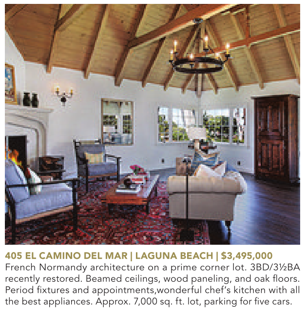405 EL CAMINO DEL MAR | LAGUNA BEACH | $3,495,000 French Normandy architecture on a prime corner lot. 3BD/3½BA recently restored. Beamed ceilings, wood paneling, and oak floors. Period fixtures and appointments,wonderful chef’s kitchen with all the best appliances. Approx. 7,000 sq. ft. lot, parking for five cars.