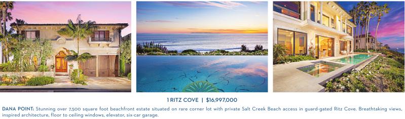 1 RITZ COVE | $16,997,000 DANA POINT: Stunning over 7,500 square foot beachfront estate situated on rare corner lot with private Salt Creek Beach access in guard-gated Ritz Cove. Breathtaking views, inspired architecture, floor to ceiling windows, elevator, six-car garage.