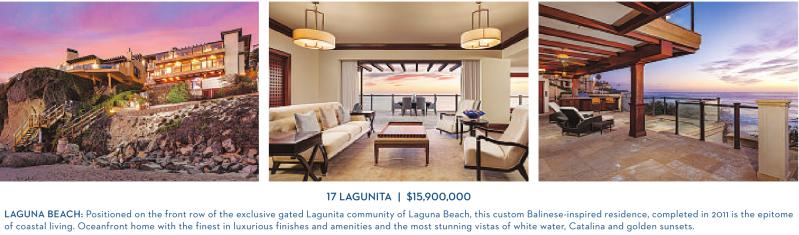 LAGUNA BEACH: Positioned on the front row of the exclusive gated Lagunita community of Laguna Beach, this custom Balinese-inspired residence, completed in 2011 is the epitome of coastal living. Oceanfront home with the finest in luxurious finishes and amenities and the most stunning vistas of white water, Catalina and golden sunsets.