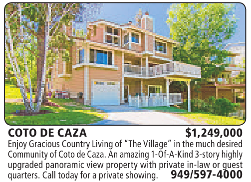 COTO DE CAZA $1,249,000 EnjoyGracious CountryLiving of “The Village” in themuch desired CommunityofCotodeCaza. An amazing1-Of-A-Kind 3-story highly upgraded panoramic view property with private in-law or guest quarters. Call todayfor aprivate showing. 949/597-4000