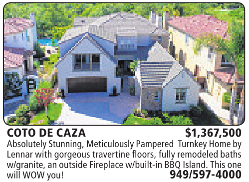 COTO DE CAZA $1,367,500 Absolutely Stunning, Meticulously Pampered Turnkey Home by Lennar with gorgeous travertine floors,fully remodeledbaths w/granite, an outsideFireplace w/built-in BBQIsland.This one will WOWyou! 949/597-4000