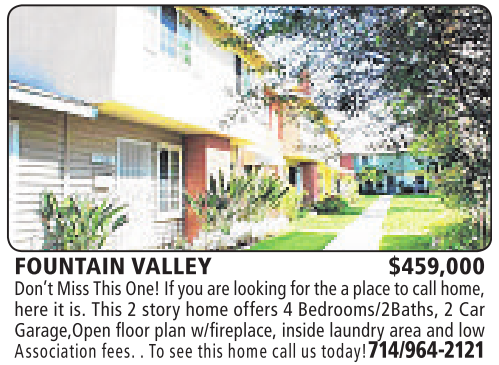 FOUNTAIN VALLEY $459,000 Don’tMissThisOne!Ifyou arelooking for theaplace to call home, here it is. This 2story home offers 4Bedrooms/2Baths, 2Car Garage,Open floor plan w/fireplace, inside laundry area and low Association fees. .Tosee this homecallustoday!714/964-2121