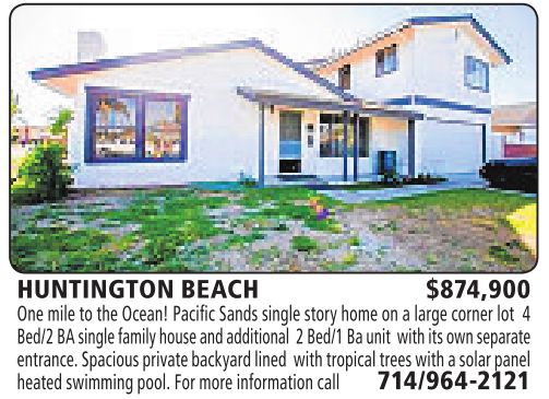HUNTINGTON BEACH $874,900 Onemiletothe Ocean!PacificSandssingle storyhome on alarge corner lot 4 Bed/2 BA singlefamily house andadditional 2Bed/1Baunit withits ownseparate entrance.Spacious private backyard lined withtropicaltrees with asolar panel heatedswimmingpool. Formore informationcall 714/964-2121