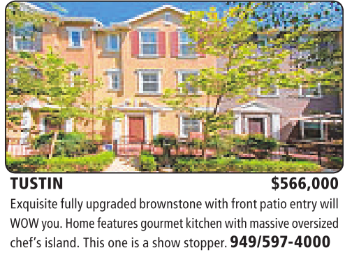 TUSTIN $566,000 Exquisitefully upgraded brownstone with frontpatio entrywill WOW you. Home featuresgourmetkitchen with massive oversized chef’sisland.Thisone is ashowstopper. 949/597-4000