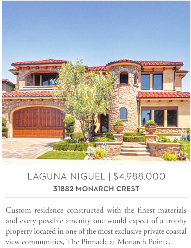 LAGUNA NIGUEL | $4,988,000 31882 monarch crest Custom residence constructed with the finest materials and every possible amenity one would expect of a trophy property located in one of the most exclusive private coastal view communities, The Pinnacle at Monarch Pointe.
