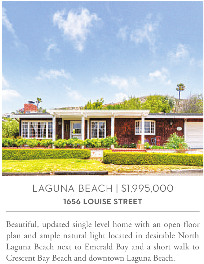 LAGUNA BEACH | $1,995,000 1656 louise street Beautiful, updated single level home with an open floor plan and ample natural light located in desirable North Laguna Beach next to Emerald Bay and a short walk to Crescent Bay Beach and downtown Laguna Beach.