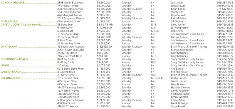 CORONA DEL MAR ........................................... 2808 Ocean Boulevard $5,500,000 Saturday 1-4 Jenna Bahl 949.887.8725 440 Rivera Terrace $3,900,000 Saturday 1-4 Eliisa Stowell 949.903.0026 308 Poinsettia Avenue $3,800,000 Saturday | Sunday 2-5 Kevin Kanda 714.612.0529 504 Fernleaf Avenue $2,000,000 Saturday 1-4 Janelle File 949.466.5661 424 Marigold Avenue $1,995,000 Saturday 1-4 Eliisa Stowell 949.903.0026 2519 Bungalow Place, 4 $1,595,000 Saturday | Sunday 1-4 Rick McIntire 949.697.1555 COSTA MESA..................................................... 420 Lenwood Drive $1,395,000 Sunday 1-4 Jill Chomer 949.302.5398 CRYSTAL COVE | CustomHomesite..................... 48 Deep Sea* $3.5-$7.5 MM Saturday 10-5 Sales Pavilion 949.720.2683 9 High Water $12,998,000 Saturday 12-5 Lili Kung Peters 949.697.8062 6 Scenic Bluff $7,595,000 Saturday 12-5:30 Rob Smith 949.697.8855 16 Gondoliers Bluff $6,500,000 Sunday 1-4 Jim Weisenbach | Jane Polley 949.422.8611 26 Surfspray Bluff $4,788,000 Saturday | Sunday 1-4 Patricia Carson 949.922.7399 8 Sidra Cove $3,695,000 Saturday 1-4 Jim Weisenbach | Jane Polley 949.422.8611 26 Sidney Bay Drive $2,595,000 Sunday 1-4 Jim Weisenbach | Jane Polley 949.422.8611 DANA POINT ..................................................... 43 Beach View Avenue $13,349,000 Saturday | Sunday Appt. Brian Thomas | Jennifer Thomas 949.422.6409 32571 Seven Seas Drive $1,649,000 Saturday 1-4 Marcus Skenderian 949.295.5758 24312 Titus Drive $945,000 Saturday 1-4 Gary Macrides 949.370.6827 24692 Jeremiah Drive $764,900 Sunday 12-3 Gary Macrides 949.370.6827 HUNTINGTON BEACH....................................... 8461 Ivy Circle $948,000 Saturday 1-4 Stacy McKellar | Holly Larsen 714.264.2294 8461 Ivy Circle $948,000 Sunday 12-3 Stacy McKellar | Holly Larsen 714.264.2294 IRVINE ................................................................ 1 Gaviota $2,075,000 Saturday 1-4 Stacy McKellar | Chris Kwon 714.264.2294 6212 Sierra Siena Road $1,495,000 Saturday 1-4 Tad Baltzer 949.554.4140 LADERA RANCH................................................ 8 Gaucho Road $1,499,999 Saturday 1-4 Rhonda Russell 949.395.7399 2 Fayette Circle $1,399,000 Saturday | Sunday Appt. Brian Thomas | Jennifer Thomas 949.422.6409 LAGUNA BEACH................................................ 1315 Pitcairn Place $3,395,000 Saturday 12:30-4:30 Phillip Caruso 949.293.7334 495 Legion Street $2,495,000 Saturday 1-4 Traudi Hansen 949.887.3417 495 Legion Street $2,495,000 Sunday 1-4 Gary Boisen 949.274.2236 31405 Monterey Street $2,369,000 Saturday 12-2 Heather Cloward 949.228.4523 1527 Tahiti Avenue $2,350,000 Saturday 1-4 Sandy Rabahieh 949.306.1073 138 McAulay Place $2,299,000 Saturday 1-4 Sean McCracken 949.290.5317 138 McAulay Place $2,299,000 Sunday 1-4 Penny Svenson 949.632.2252 650 Virginia Park Drive $1,999,000 Saturday | Sunday Appt. Carrie Adam 949.322.3985 450 Bent Street $1,895,000 Sunday 1-4 Frank Hufnagel 949.444.8718 31644 2 nd Avenue $1,550,000 Saturday 1-4 Sonja Powell 949.510.1186
